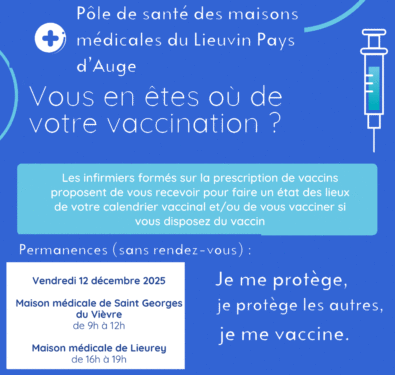 Des permanences pour faire un état des lieux de votre vaccination vous sont proposées vendredi 12 décembre de 9h à 12h à la maison médicale de Saint Georges du Vièvre et de 16h à 19h à la maison médicale de Lieurey.